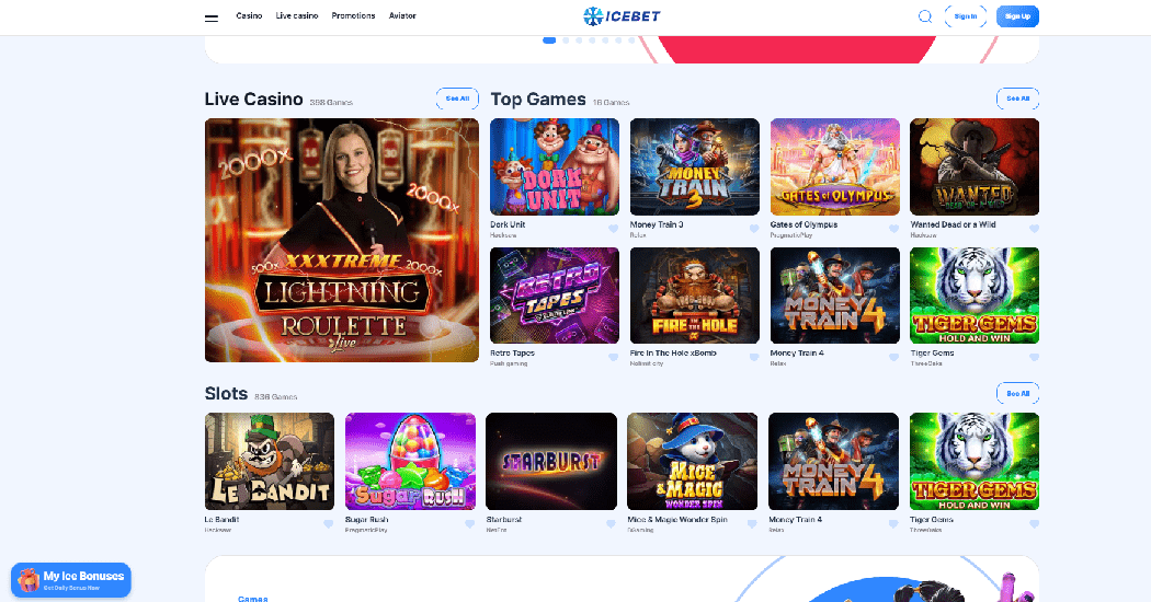 IceBet Casino offers a vast selection of over 5000 games, including numerous slots like Neptune's Fortune Megaways, table games such as multiple variations of roulette, blackjack, baccarat, and poker. The casino collaborates with over 40 gaming software suppliers like BetSoft, NetEnt, Microgaming, Evolution, Quickspin, Yggdrasil, among others. The site has a user-friendly structure, with a main banner for navigation to the Casino, Live Casino, and Promotions sections, and gaming sub-categories displayed under the main banner.