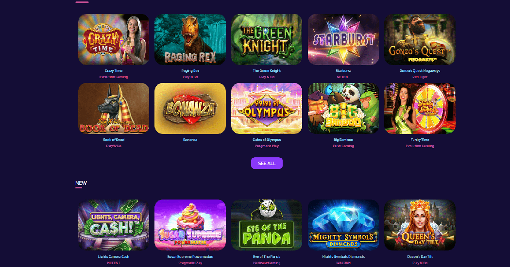 The casino has a rather extensive collection, so there should be something for any taste. Slots like Mega Moolah, Jammin' Jars, Dragon Born, Starburst XxxTreme, Narcos, Bonanza, Aztec Gold Megaways, Gonzo's Quest Megaways, and Starz Megaways are just a few of the numerous options. European, French, and American Roulette, Atlantic City and Vegas Single Deck Blackjack, Casino Hold 'Em, Cribbage, Punto Banco, Sic Bo, Caribbean Stud Poker, Three Card Poker, and many other card and table games are all available. You may simply determine if a game is right for you by trying out a trial version (this does not apply to live games).