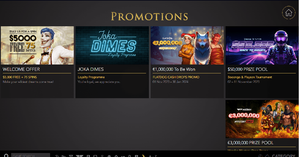 The website's design makes it simple to find what you need. You will see circular buttons labelled "Promotions," "Banking," "General," and "Promo Terms" over on the site's left side. There is a sizable item labelled "Category" in the bottom right of the webpage; clicking this brings up a sliding menu listing the many types of games offered.