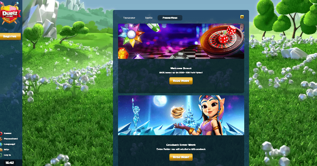 The welcome offer at Duelz Casino includes a 100% deposit match up to €100 along with 100 bonus spins for the Book of Dead slot machine.