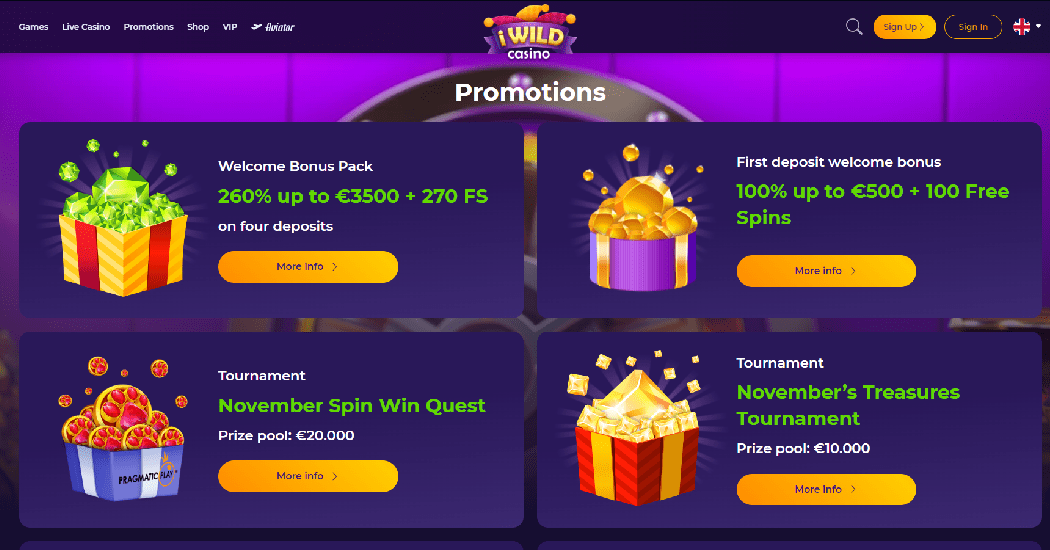 iWild Casino provides a comprehensive Welcome Package up to €3500 along with 270 free spins for new players across their first four deposits. Following this, regular promotions include a Wednesday deposit bonus, a Weekend Reload Bonus, and a Weekly Cashback offer. Additionally, players can earn loyalty points equivalent to 5% of their deposits, with additional points available by contacting Customer Support on Sundays. The VIP program comprises five tiers offering increasing privileges, such as higher withdrawal and reward limits, reduced wagering requirements, and VIP account management.
