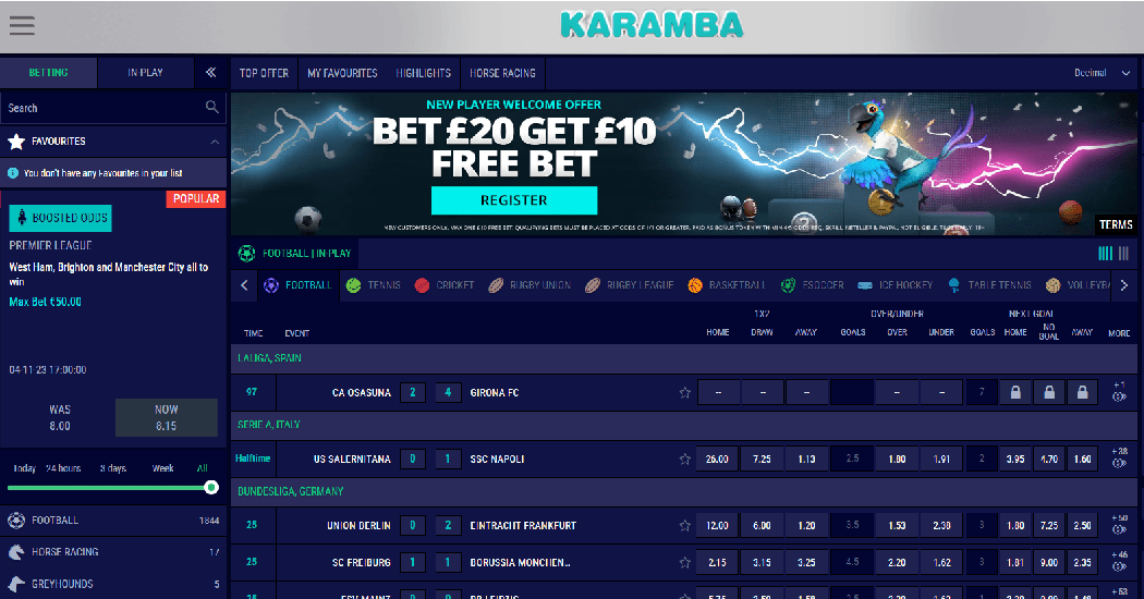 The sports betting market is another area where Karamba's parrot flies freely. Football, basketball, tennis, bandy, badminton, baseball, cricket, cycling, e-Sports, darts, boxing, American football, etc. are only some of the popular sports that are now covered by the sportsbook.